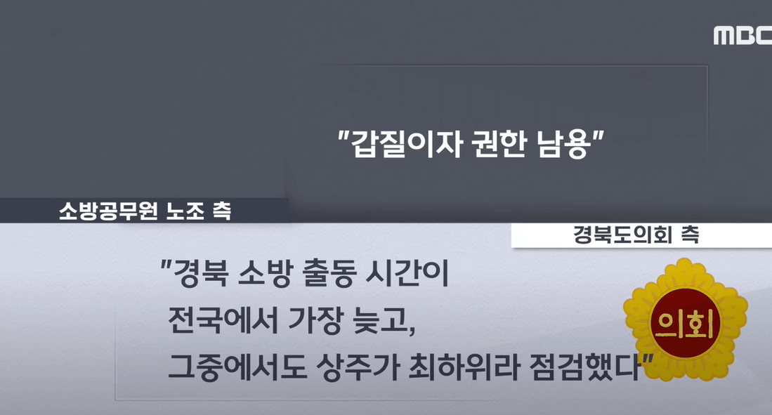 도의원들은 상주 소방관들이 전국에서 출동 시가이 가장 늦다며 뻔뻔하게 변명합니다. "논두렁이 축축해서 화염이 제대로 붙지 않았다"라고 말하며, 최근 소방차 물 분사 문제를 핑계로 들먹입니다. 도대체 이게 얼마나 무책임하고 위험한 발상입니까?