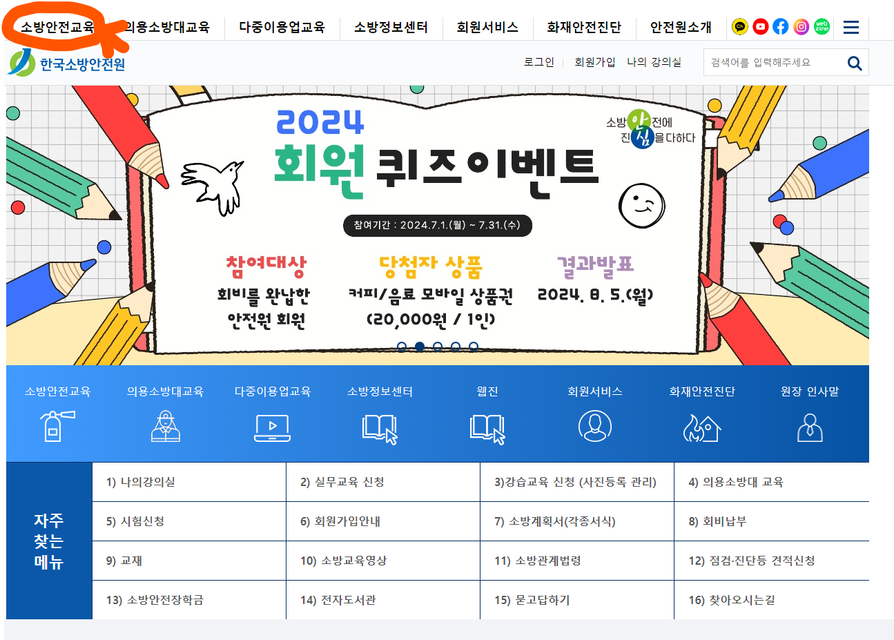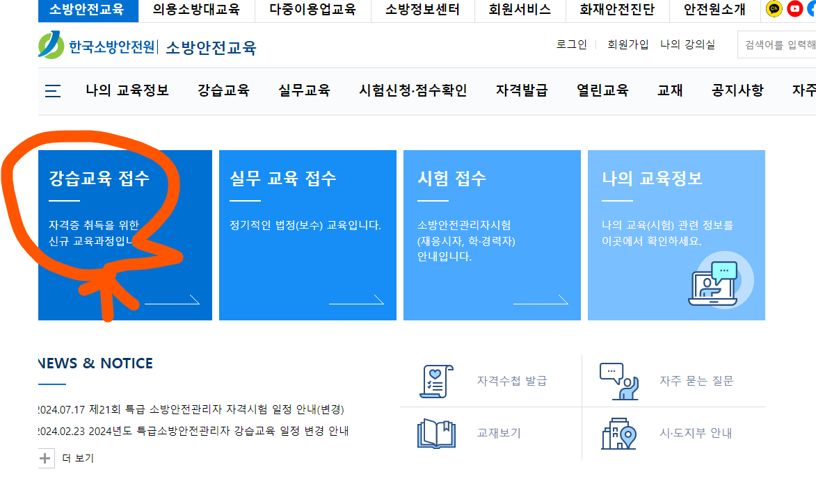 소방안전원 홈페이지를 방문하시어 아래와 같이 순서대로 진행하세요
