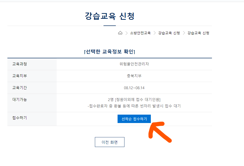 3. 강습교육신청에 위험물 안전관리자 신청하기 (클릭) 4. 일정조회 후 지역과 시간에 맞춰 (클릭)