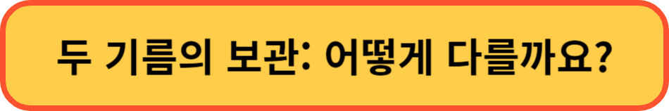 참기름과 들기름은 보관방법도 다릅니다. 참기름은 산패에 강한 편으로, 어둡고 상온에 보관하는 것이 좋습니다. 냉장고에 보관하면 특유의 향도 사라지게 되고 덩어리가 생길 수 있습니다. 이러한 참기름은 어둡고 상온에 보관을 잘하면 오랜 기간 사용할 수 있습니다. 이와는 다르게 들기름은 산패가 빨리 진행되기 때문에 냉장 보관이 필수이다 말하고 싶습니다. 혹시 들기름이 냉장고에 보관했는 굳어있었도 걱정 마세요, 굳은 들기름을 상온에 잔시 두면 원래 상태의 들기름으로 돌아옵니다. 이러한 들기름은 참기름과 달리 개봉 후에는 한 달 이내에 사용해야 합니다.