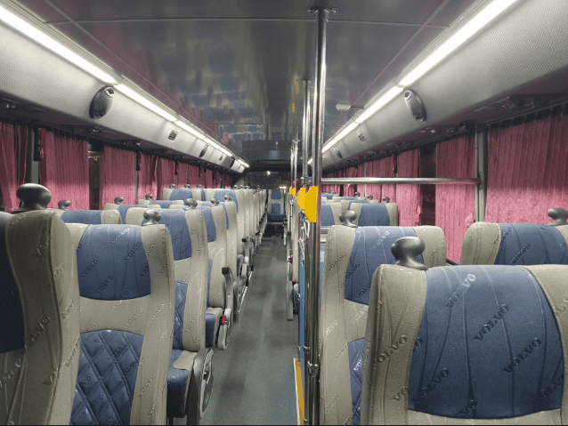 밤이라 선명하지 않고 흐렸지만 더욱 인상적이었던 2층 버스의 모습은 일반버스와는 완전히 달랐습니다. 볼보(VOLVO) 로고가 새겨진 시트들이 정갈하게 놓인 내부는 마치 작은 여객기의 객실 같았습니다. 분홍빛 커튼과 은은한 조명이 어우러져 아늑한 분위기를 자아냈습니다.
